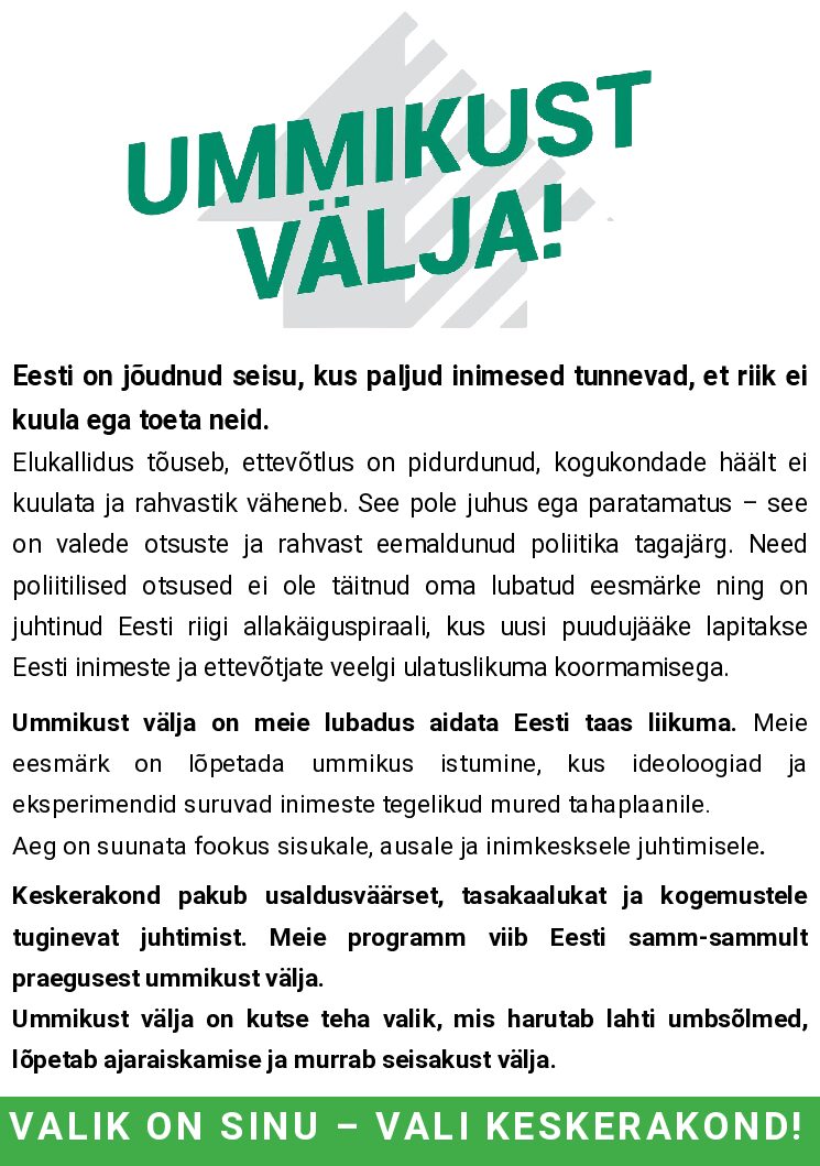Viimased poolteist aastat on näidanud, et ainult Keskerakonna juhtimisel saab Tallinnas taastuda asjatundlik linnajuhtimine. Sinu toetusel tõmbame Tallinna ummikust välja!